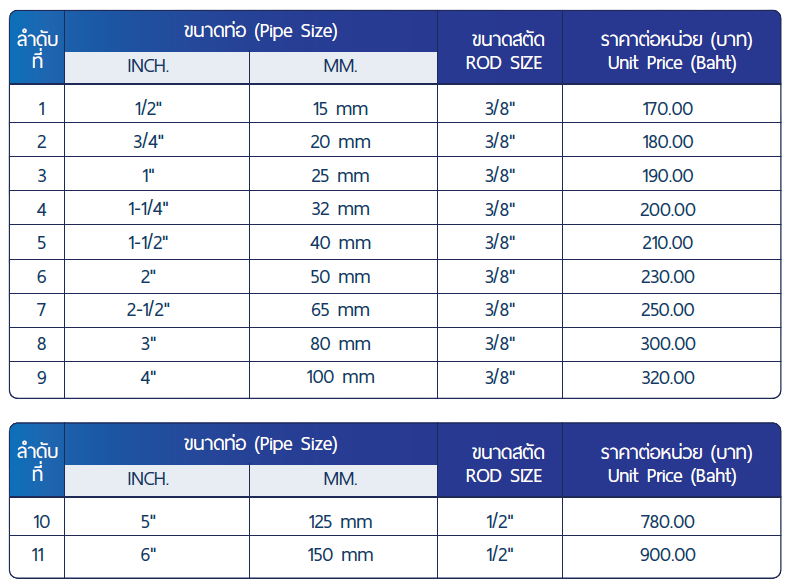 ขนาด : 1/2″ , 3/4″ , 1″ , 1-1/4″ , 1-1/2″ , 2″ , 2-1/2″ , 3″ , 4″ , 5″ , 6″